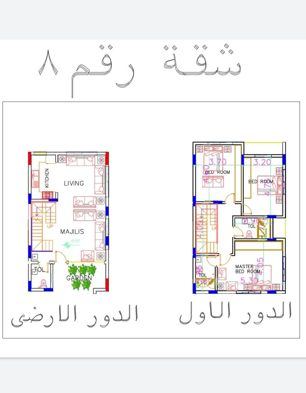 شقة رقم ٨ : صاله ، طاولة طعام ،مطبخ امريكي ، ١ غرفة ماستر ،٢ غرفة نوم ،٣ دورات مياه مايميز شقة رقم ٨ ؛ زاوية ، اطلالة خارجية ، اطلالة داخلية ، موقف خارجي ، شرفة مطلة، حديقة داخليه ،طابقين داخليه .. * المساحه : شقة ٨: ١٧٢متر. جديده لم تسكن